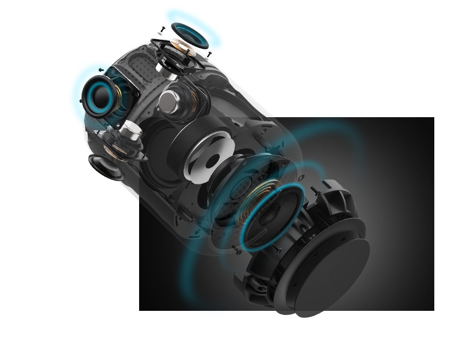 - Vďaka dokonale navrhnutej polohe 4 výškových reproduktorov a 1 basového reproduktora poskytuje T6 Max vyvážený priestorový zvuk, aby si každý mohol vychutnať rovnako vynikajúci zvuk z akéhokoľvek uhla.
