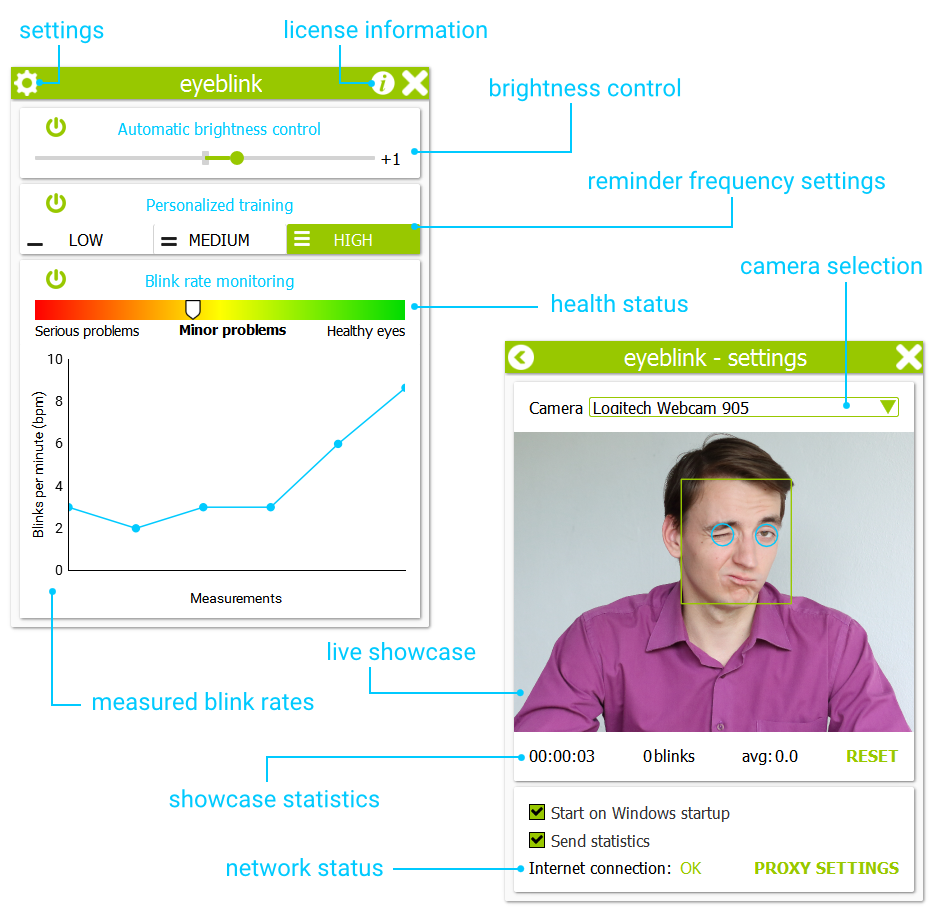 Za použitia jeho nového algoritmu, eyeblink meria frekvenciu žmurknutí používateľa. Zdravý človek žmurká 10 až 15 krát za minútu. Vďaka eyeblink-u ľahko zistíte či patríte medzi rizikovú skupinu syndrómu suchého oka. Eyeblink vám pomôže žmurkať viac s využitím interaktívnej notifikácie, ktorá sa vysunie iba v prípade, ak ste dlhšie nežmurkli a zmizne okamžite po vašom následnom žmurknutí.