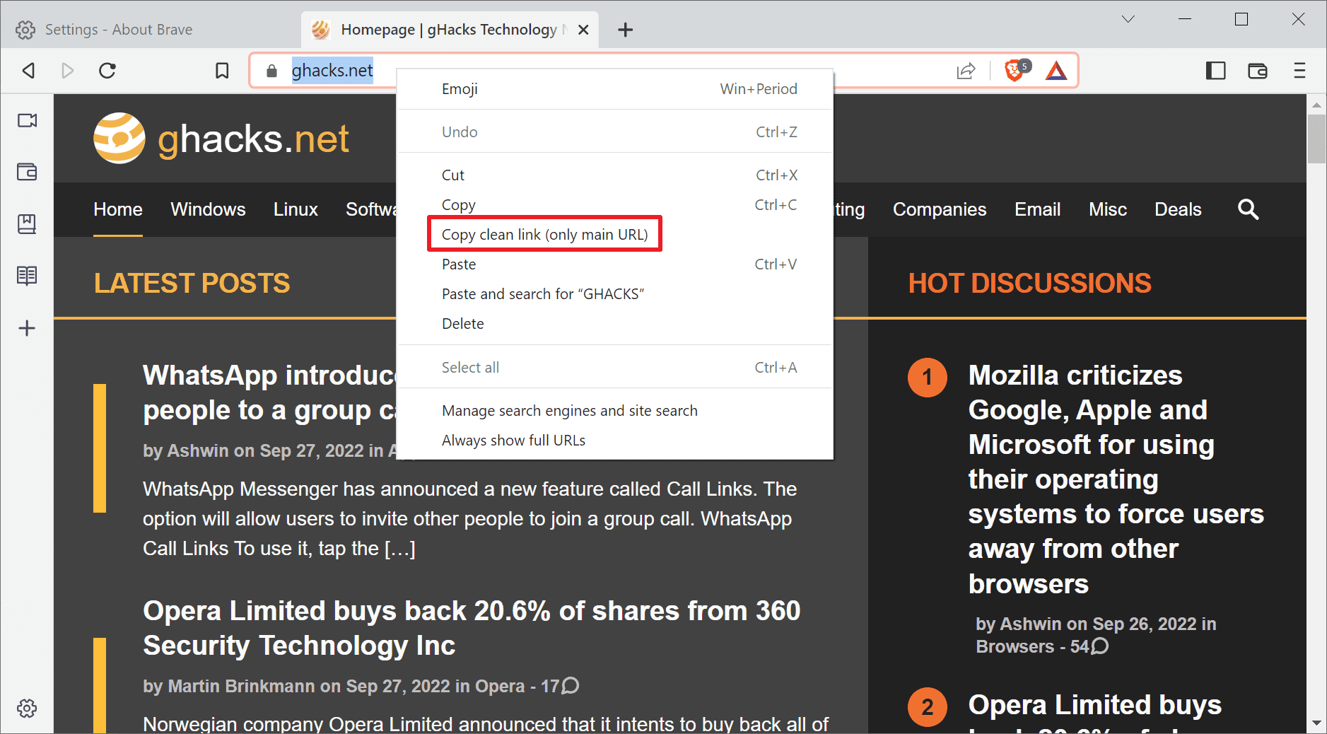 Brave pridal do vývojárskej edície určenej pre testerov novú možnosť pri kopírovaní odkazov stránok. Nová funkcia pribudla v kontextovom menu riadka s adresou. Podľa webu ghacks.net, ktorý informáciu priniesol bude nová položka v menu kopírovať len čistú URL adresu stránky. Tak sa funkcia aj nazýva a Copy Clean Links bude znamenať to, že po sebe nebudete zanechávať toľko sledovacích stôp.