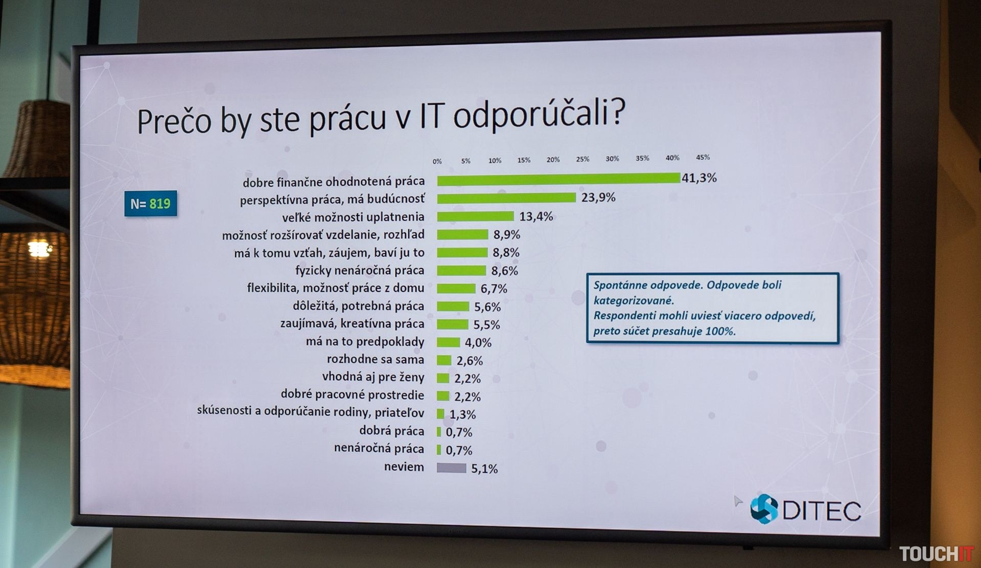 Rodičia odporúčajú dcéram kariréru v IT najčastejšie z dôvodu vysokého finančného ohodnotenia. Okolo 80% rodičov prácu v IT svojim deťom odporúča. Ďalším dôvodom je perspektíva do budúcnosti a možnosti uplatnenia.