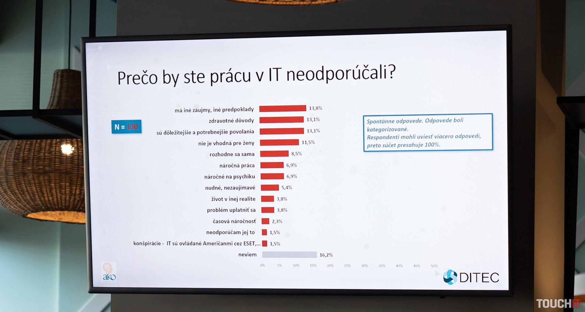 Na strane dôvodov, prečo kariéru v IT neodporúčať dcére sú iné záujmy a zdravotné dôvody. Podľa niektorých sa treba zaujímať o „dôležitejšie a potrebnejšie povolania“. Takmer polovica ľudí, ktoré dcére zamestnanie v IT neodporúčajú sa tak rozhodla preto, že treba uprednostniť rodinu pred kariérou a rodina stojí na žene. Objavil sa dokonca názor, že IT riadia u nás Američania cez firmu ESET (1,5 % opýtaných) a preto v IT nemá zmysel pracovať.