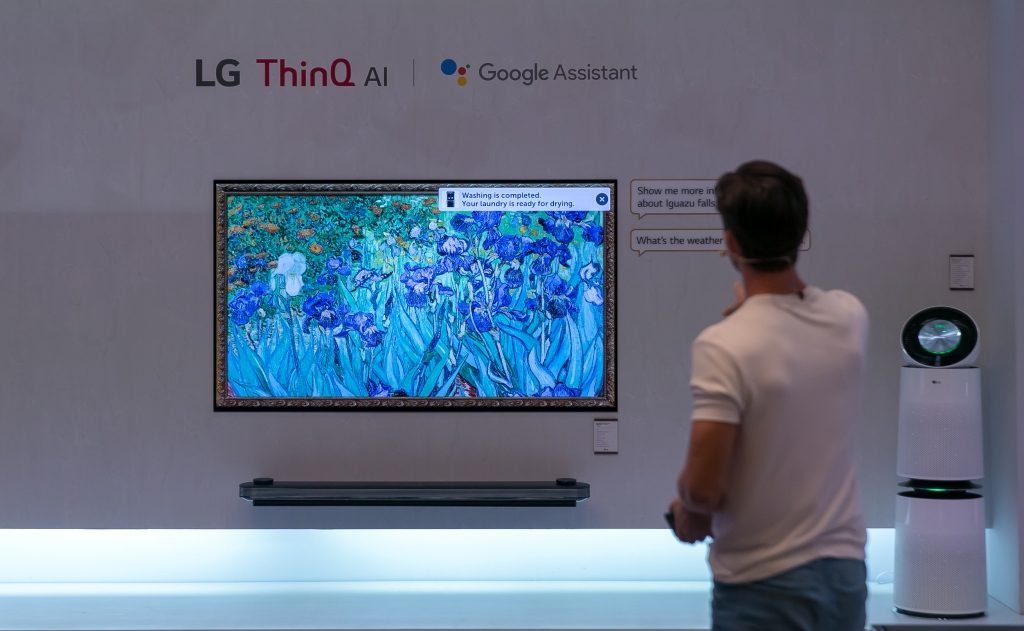 Spoločnosť LG na výstave IFA venovala polovicu stánku technológii, ktorú označuje ako ThinkQ. Táto firma má totiž úzku spoluprácu so spoločnosťou Google a zabudovala Google Assistant do viacerých svojich zariadení vrátane televízorov. Znamená to, že sa mení spôsob ovládania a komunikácie človeka s televízorom. Na prezentácii sme potom videli kompletne prepojenú domácnosť, ktorá sa dala ovládať hlasom, v tomto prípade v nemčine. Na televízor boli napr. prepojené svietidlá Philips Hue. Stačilo potom zobrať do ruky diaľkový ovládač od televízora, ktorý je vybavený aj mikrofónom a vysloviť svoje želanie. V preklade: „Zapni svetlá na 100 % výkon.“ Výhoda je, že tu nemusíte hovoriť to otravné: „Hey Google“ – začiatok povelu nahradzuje samotné stlačenie tlačidla mikrofónu na diaľkovom ovládači. A hneď môžete pokračovať: „Nastav farbu svetiel na červenú.“ Hlasové povely sa týkajú samozrejme aj samotného televízora, pričom je dostupné aj rozpoznávanie názvu stanice. Napríklad: „Prepni na CNN“ a televízor sa skutočne prepol na stanicu CNN zo satelitného zdroja. Tiež sme počuli povel: „Nastav režim obrazu na Dynamický.“ Mimochodom takto sa dá rýchlo nastaviť v televízore obraz aj zvuk jednoduchým vyslovením povelu: „Cinema mód.“ Toto by ste klasicky diaľkovým ovládačom robili na dvakrát.
