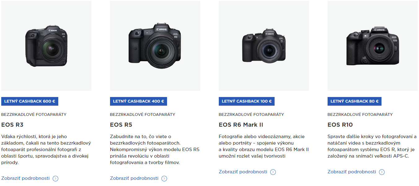 V rámci bezzrkadloviek máte k dispozícii 6 modelov vrátane EOS R5 alebo napríklad EOS R10. Kategória digitálnych zrkadloviek je zastúpená modelom EOS-1D X Mark III a tu je možné získať až 500 eur späť. Vyberať môžete z veľkého počtu objektívov série RF, mini fototlačiarní alebo si vybrať jednu z dvoch video kamier.