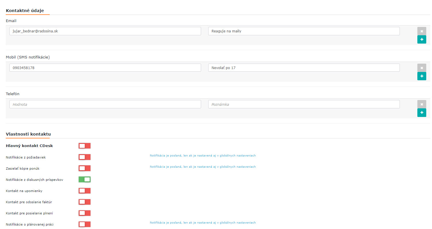 To je veľmi šikovný modul. O vašom kontakte si toho môžete zaznamenať naozaj veľa. Okrem mena, titulov, mailovej adresy, mobilu je to aj nastavenie, či sa mu automaticky zasielajú faktúry, upomienky, notifikácie s požiadaviek a pod. Ak chcete, dajú sa sem zaznamenať aj úplne detailné informácie ako sú napr. obľúbené reštaurácie či hobby danej osoby. Opäť to zlepšuje vzťah s daným kontaktom.