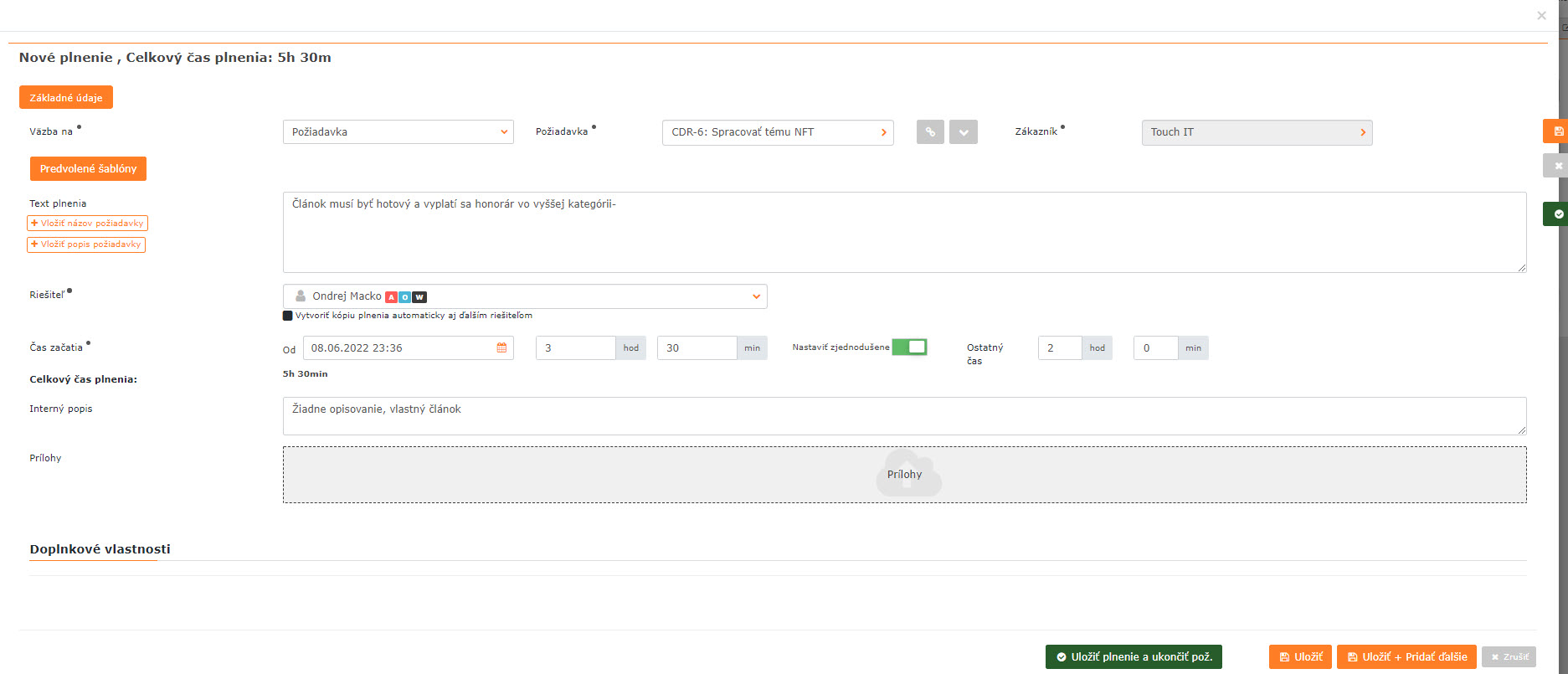 To, ako sa podarilo splniť vaše požiadavky sa dozviete v module Plnenia. Tu zistíte, ako sú reálne vyťažení vaši zamestnanci ale zároveň sa postráži vystavenie faktúry po splnení danej úlohy. Nestane sa vám tak, že prácu splníte a zabudnete na jej fakturáciu partnerovi. K jednotlivým plneniam potom môžete zaevidovať aj použitý materiál, dodaný tovar, dopravné náklady či parkovné.