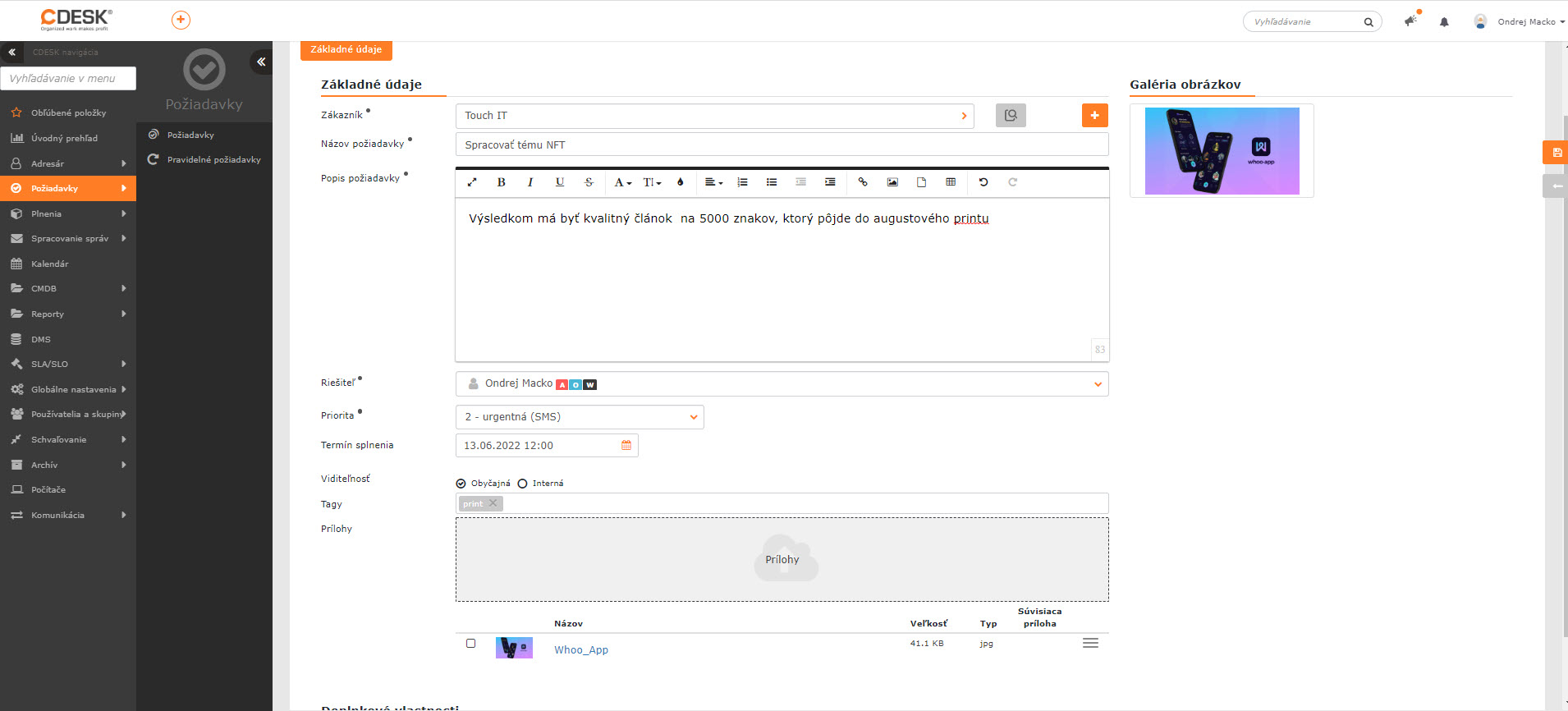 Asi najdôležitejším modulom sú Požiadavky (ticketing). V tomto prípade zadávate Názov požiadavky a jej bližší popis. Vopred vyplnené máte, kto bude jej riešiteľ (dá sa zmeniť), aká je jej priorita a viditeľnosť (len interne alebo viditeľné aj pre vašich partnerov) a môžete určiť prílohy. Hneď ako zadáte Požiadavku, príde do mailu riešiteľovi notifikácia. Vy zároveň vidíte túto požiadavku v zozname a máte možnosť sledovať, kedy presne sa splnila a prípadne prečo sa do stanoveného termínu nesplnila.
