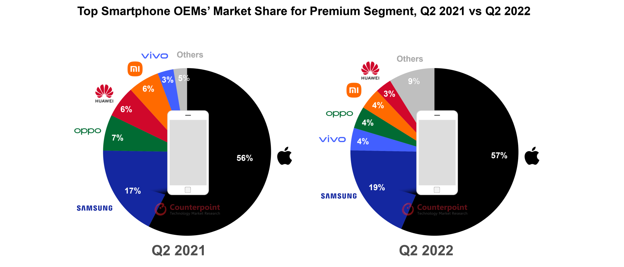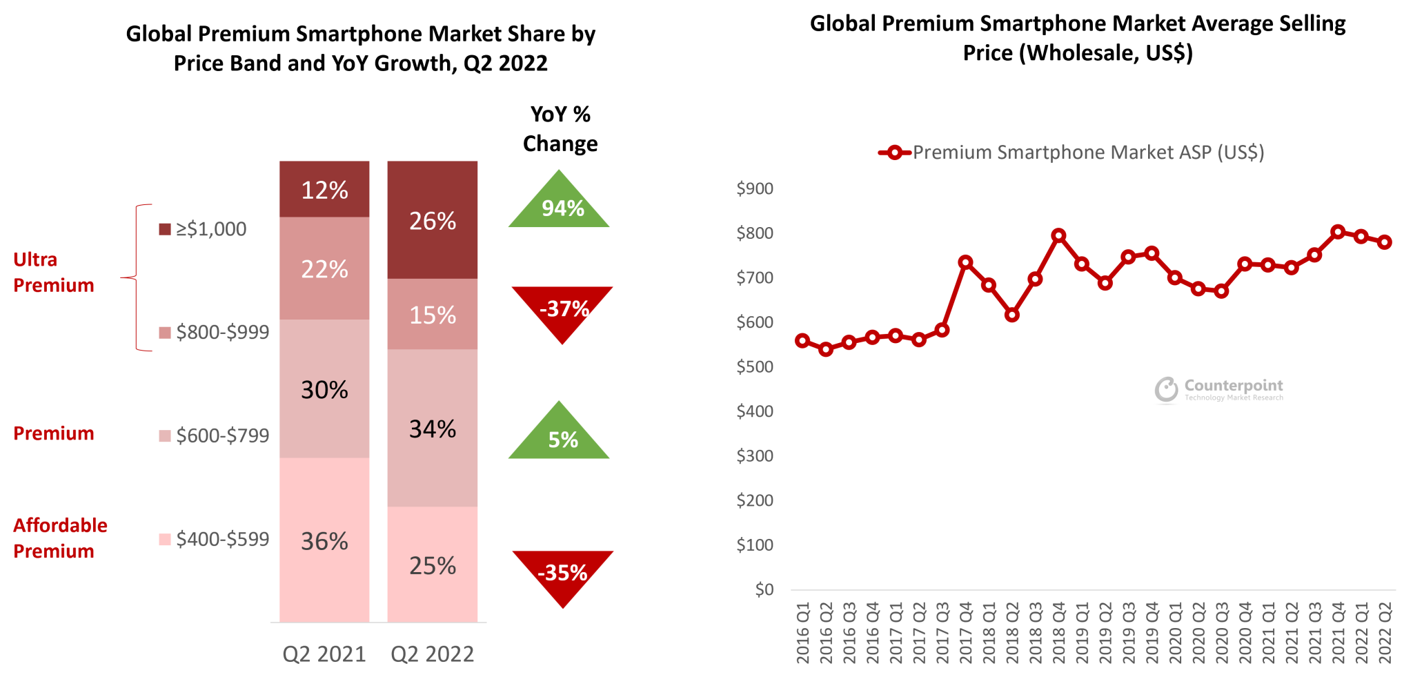 Counterpoint Research hovorí, že medziročne narástla predajnosť smartfónov v prémiovom segmente o 94 %. Hovoríme o cene smartfónov za cenu 1000 USD a vyššej. Varun Mishra, senior analytik, k cenovému rastu uviedol: „5G sa čoraz viac rozširuje, zákazníci chcú modernizovať svoje zariadenia.“ Ďalej dodáva, že podiel na zvyšovaní priemernej predajnej ceny má spoločnosť Apple, u ktorej bol zaznamenaný medziročný nárast o 14 % a tvorí viac ako 78 % podiel predaja v segmente nad 1000 USD.