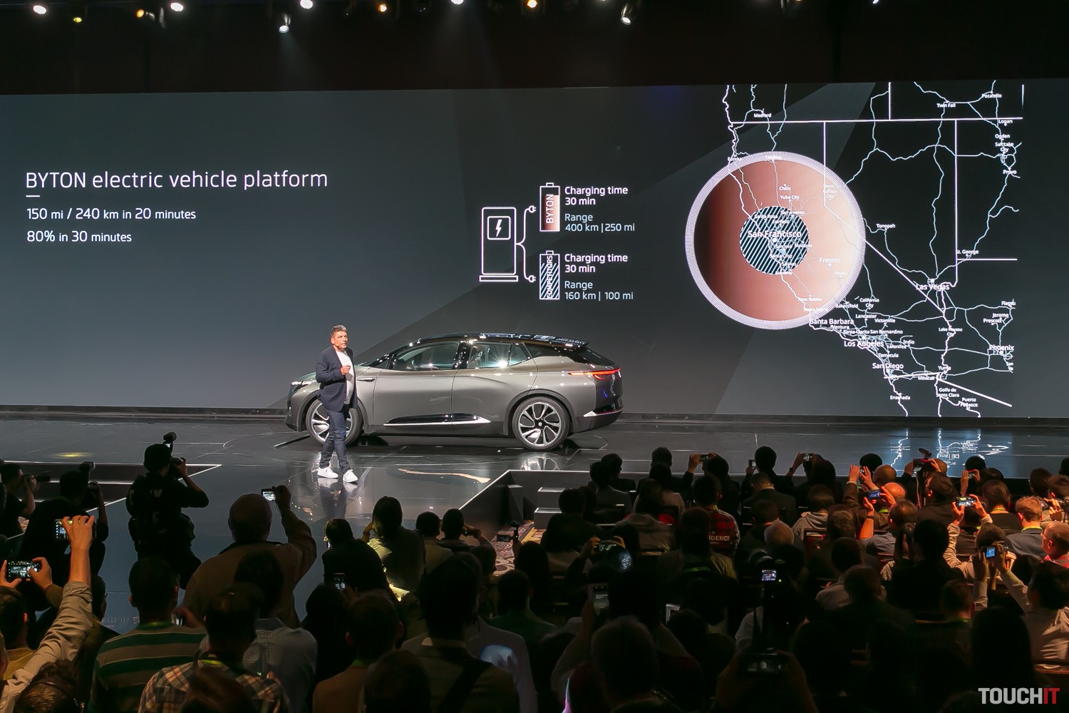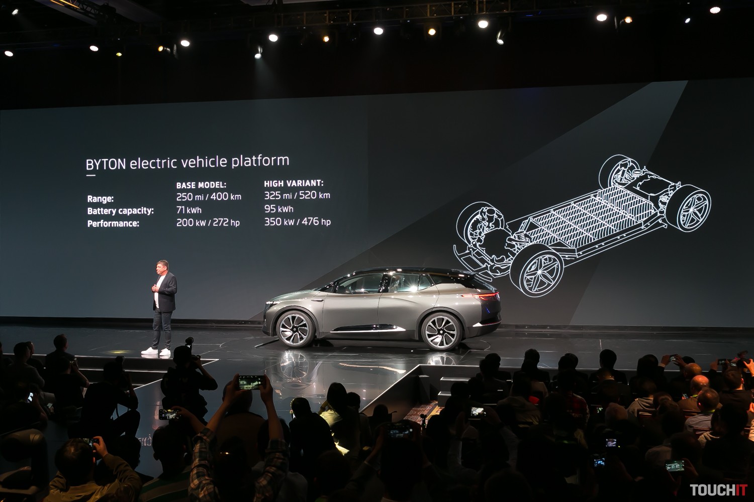 Dvaja Nemci totiž na pódium priviezli elektrické auto, ktoré sa bude vyrábať v Číne a v predaji bude v USA, v Európe a tiež v Číne. Byton je názov auta ako aj samotnej firmy a na podvozku a elektrickej pohonnej technológii má existovať viacero verzií tohto auta.