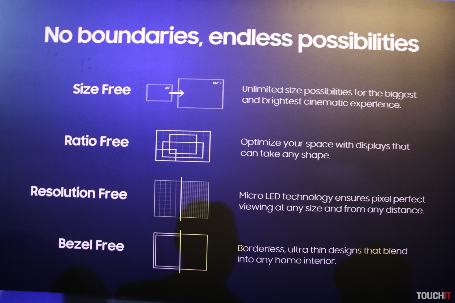 Znamená to, že pomocou MicroLED technológie si poskladáte televízor v takej veľkosti ako budete potrebovať. Zároveň je MicroLED aj možnosť voliť rozlíšenie, spomínalo sa konkrétne 4K, 5K, 8K ale pokojne aj 10K. ďalej si používateľ volí veľkosť rámiku a tiež pomer výška/šírka. Predstavený 75-palcový MicroLED je teraz vhodný aj na použitie v domácnostiach.