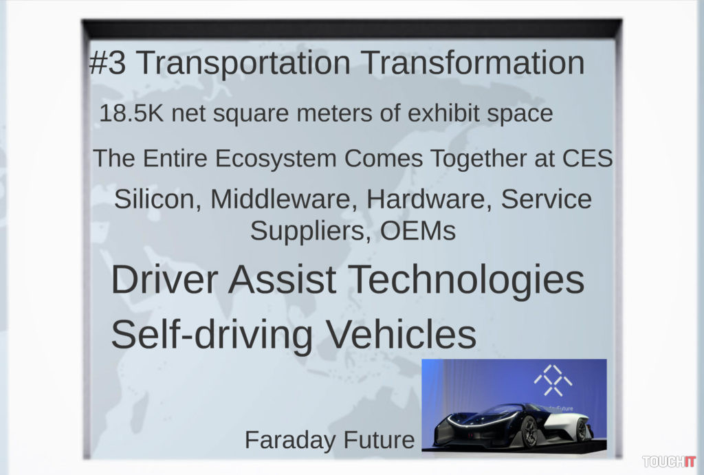 Veľkým trendom na CESe budú inteligentné autá. Google so svojimi vozidlami najazdil vyše 2,8 milióna kilometrov a požiadavka od ľudí na autonómne autá je obrovská. Vedú ich k tomu každodenné zápchy, kde strácajú mnoho času doslova nič nerobením.