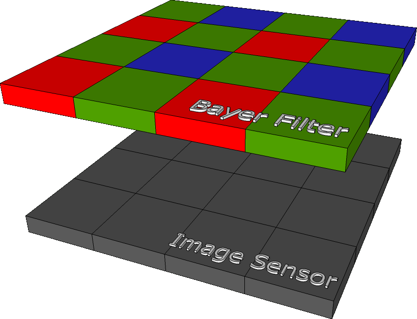 Informácia o farbe pochádza z tzv. Bayerovej masky, čo je tenká vrstva filtrov nachádzajúca sa nad samotnými detektormi svetla. Má podobu šachovnice, pričom každý pixel má nad sebou buď červený, zelený alebo modrý filter, ktorý do detektora prepúšťa len vlnovú dĺžku svetla danej farby. Každý pixel je teda trvalo jednofarebný. Keďže ľudské oko je najcitlivejšie na zelenú zložku svetla, počet „zelených pixelov“ na detektore je toľko, koľko modrých a červených spolu. Napríklad na 8 Mpx senzore nájdeme štyri milióny zelených pixelov, dva milióny modrých a dva milióny červených.
