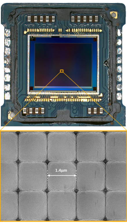 CMOS senzor, nachádzajúci sa na dne fotoaparátu, pripomína klasický čip. Jeho úlohou je zaznamenať svetelnú informáciu, ktorá na jeho povrch dopadá cez optickú sústavu. V skutočnosti však ide o komplexný integrovaný obvod, ktorý na rozdiel od iných čipov nemá žiadny kryt. Obsahuje množstvo tranzistorov, zosilňovačov, konvertorov či časovačov, avšak drvivú väčšinu tejto lesklej plochy, ktorú môžete vidieť na obrázkoch, tvorí priamo detekčná vrstva svetla. Celistvá je len naoko. Na detaile čipu Sony Exmor, z fotoaparátu Samsungu Galaxy S7, môžete vidieť aj pohľad na časť povrchu cez mikroskop, ktorý odhalí jednotlivé pixely.