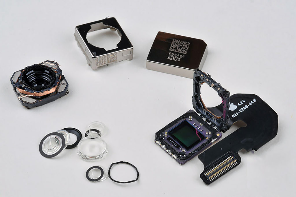 Roztvorená kamera iPhone 7, s odhaleným CMOS senzorom a optickou sústavou rozobratou na jednotlivé šošovky