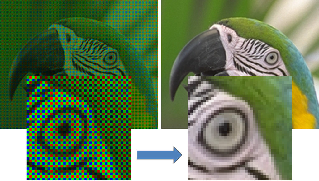 Odvodí tak výslednú RGB informáciu a pridelí ju jednému konkrétnemu bodu. Treba si uvedomiť, že farba jedného bodu je dopočítaná z informácie: zelený a modrý bod (horný riadok) a červený a zelený bod (spodný riadok). V momente, ako sa posunieme o jeden bod vedľa, informácia je už braná z iného modrého bodu, ale rovnakého zeleného (horný riadok) a iného zeleného, ale rovnakého červeného (dolný riadok).