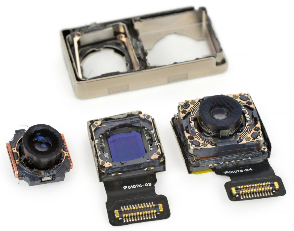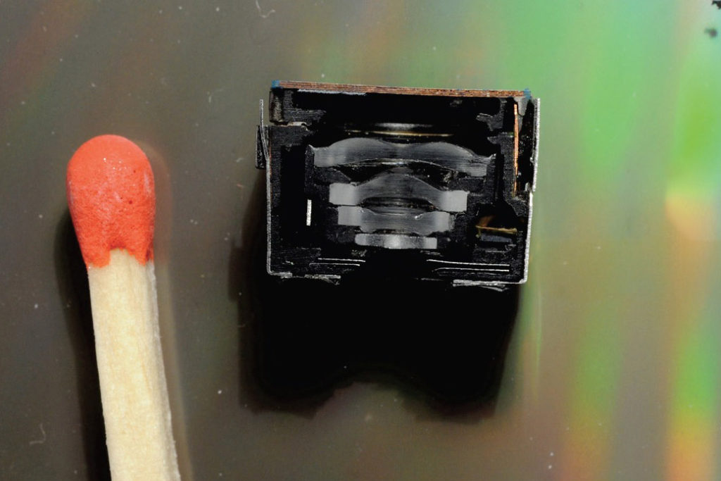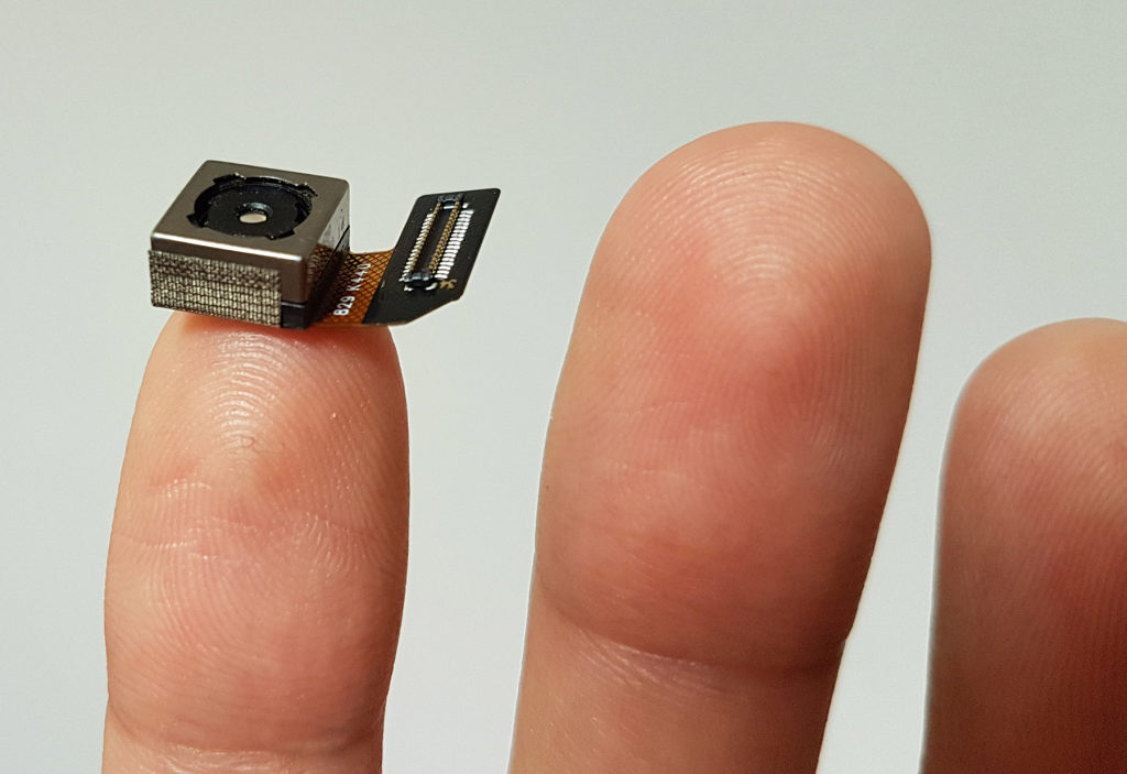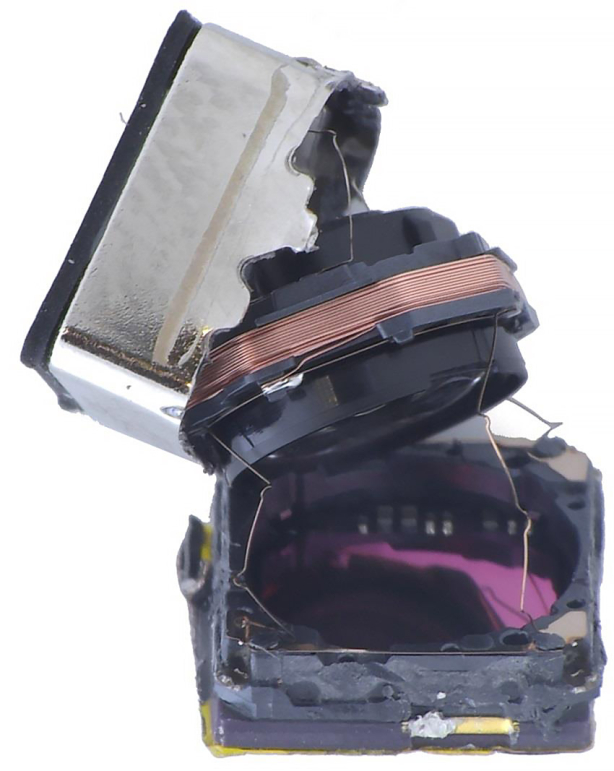 Rozlomená smartfónová kamera, odhaľujúca veľkú medenú kruhovú cievku optickej sústavy, pomocou ktorej je možné optiku posunom zaostrovať. V spodnej časti sa leskne infračervený filter, ktorý kryje CMOS senzor