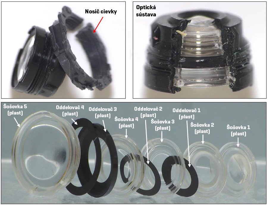 Skutočný priečny rez kamerou smartfónu, pretínajúci optickú sústavu. Dobre je vidieť výrazne odlišný tvar jednotlivých šošoviek