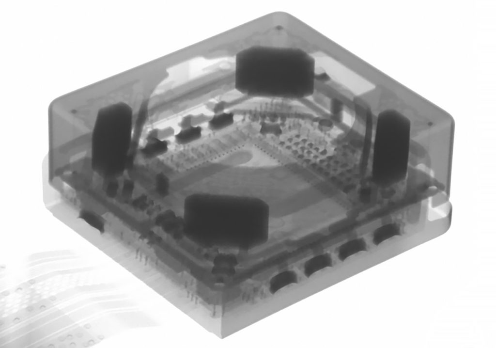 Röntgen uzavretého modulu smartfónovej kamery (iPhone), na ktorom je dobre viditeľné dno, tvorené lesklým CMOS senzorom v strede. Prázdny kruhový otvor nesie optickú sústavu, ktorá je vďaka tomu, že šošovky sú z plastu, celkom neviditeľná. Veľmi dobre je však vidieť jej kruhovú vystavovaciu cievku a štyri elektromagnety v rohoch, ktorými sa zmenou magnetického poľa ovláda. Tmavé sú takisto maličké kovové kondenzátory po bokoch CMOS