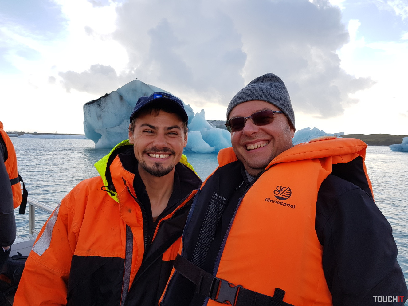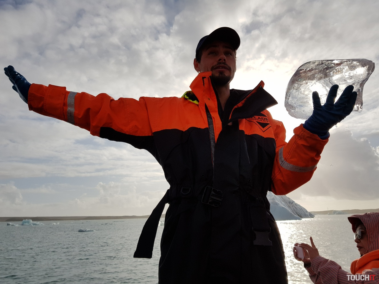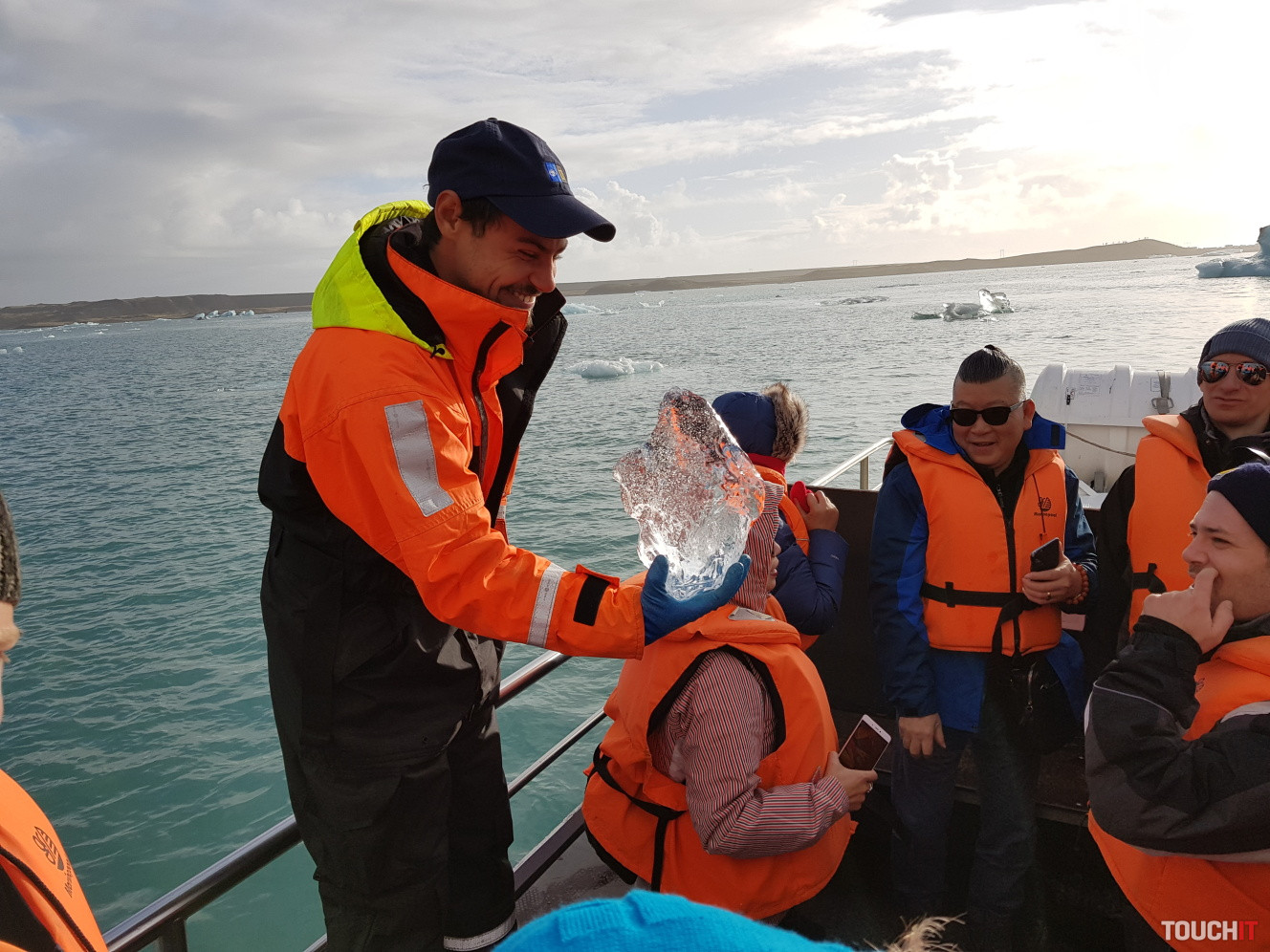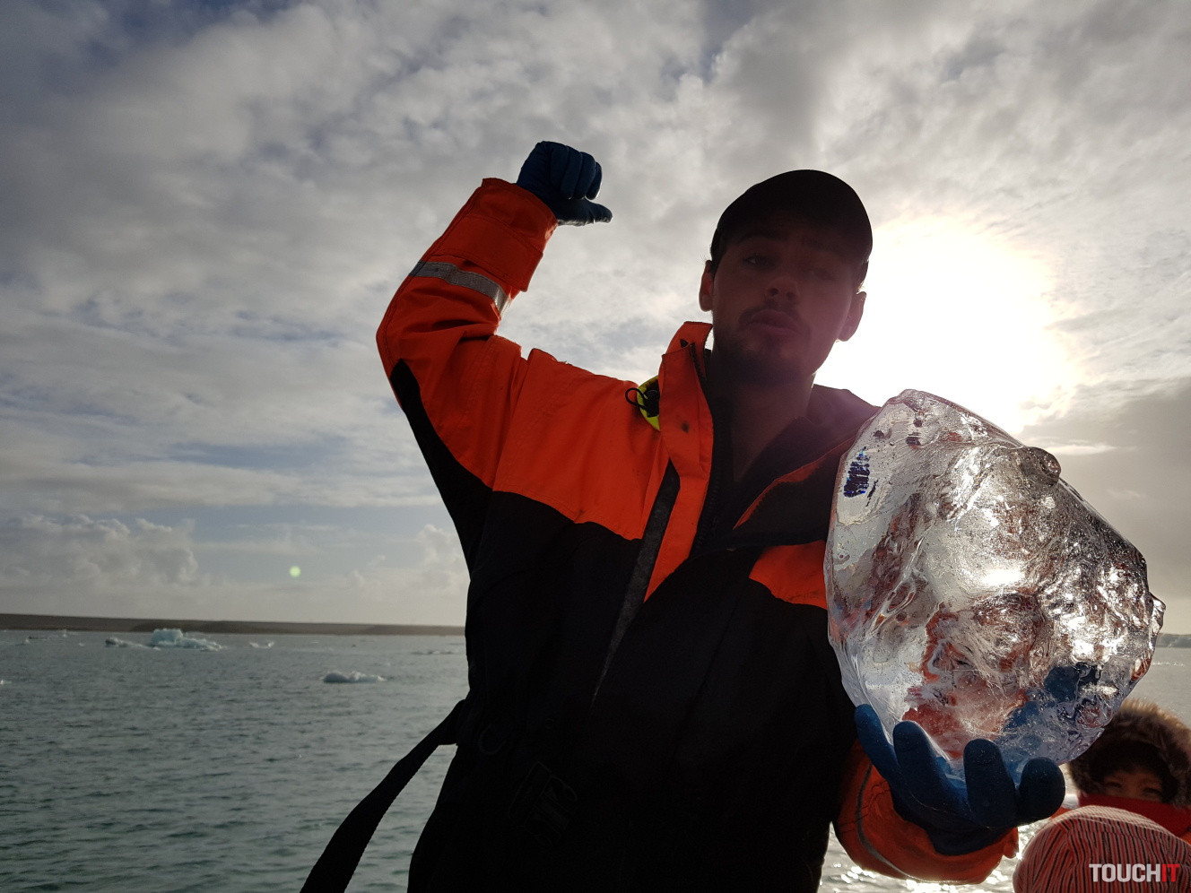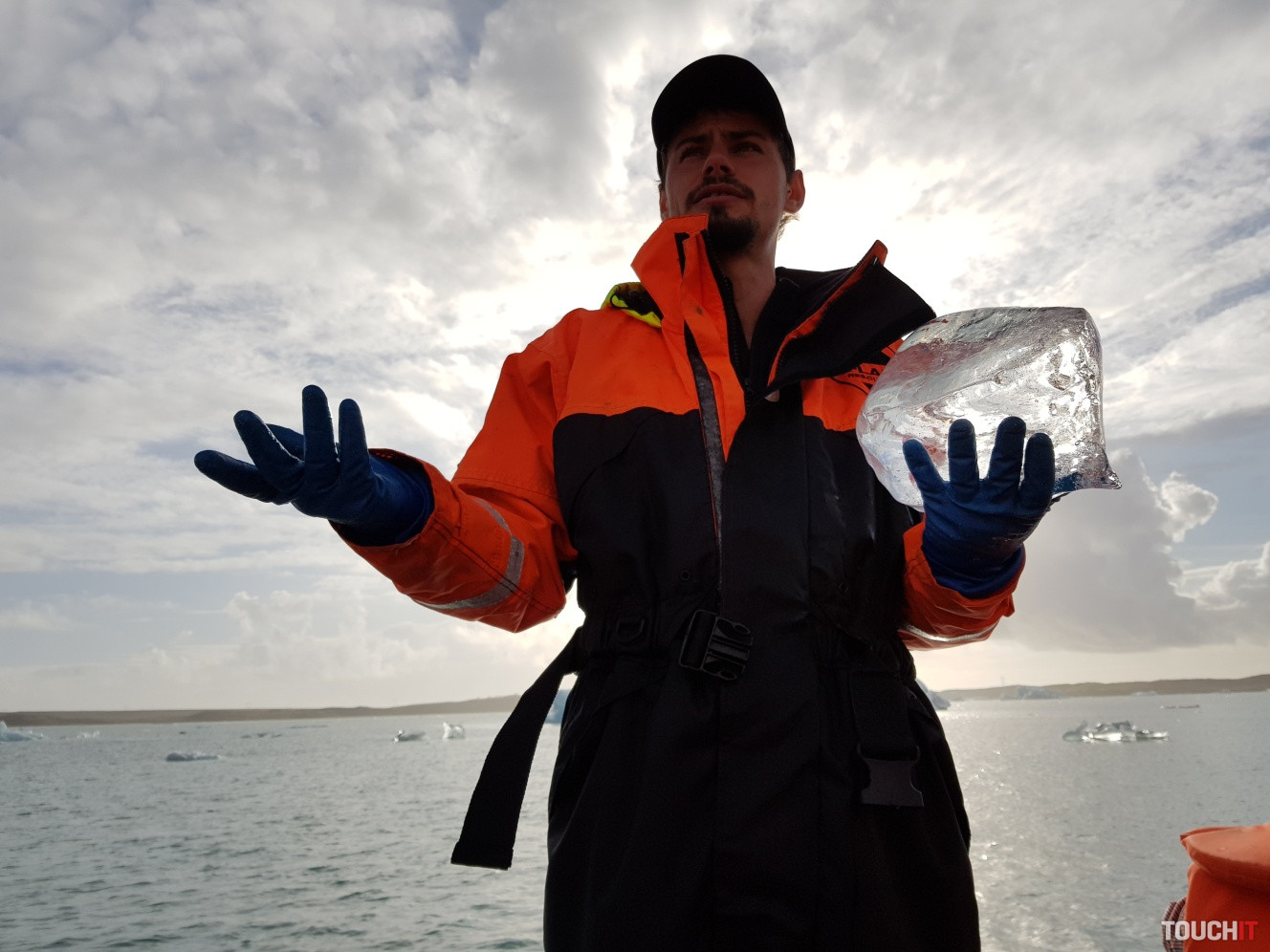 Takto toto je, páni a dámy, kus ľadovca, ktorý má viac ako 1000 rokovPomaly zliezal z obrovskej výšky pohorí za mnou až sem, aby ste si ho mohli teraz prezrieťA dostal sa až do Jokulsarlon Glacial Lagoon, kde sme ho pred chvíľkou vyloviliKeďže globálne otepľovanie pokračuje, lagúna sa časom rozširujeA čo bude ďalej? To to teraz nikto nevie, ale ak sa otepľovanie nezastaví, asi budú zatopené okolité usadlostiS našim sprievodcom sme sa aj odfotili