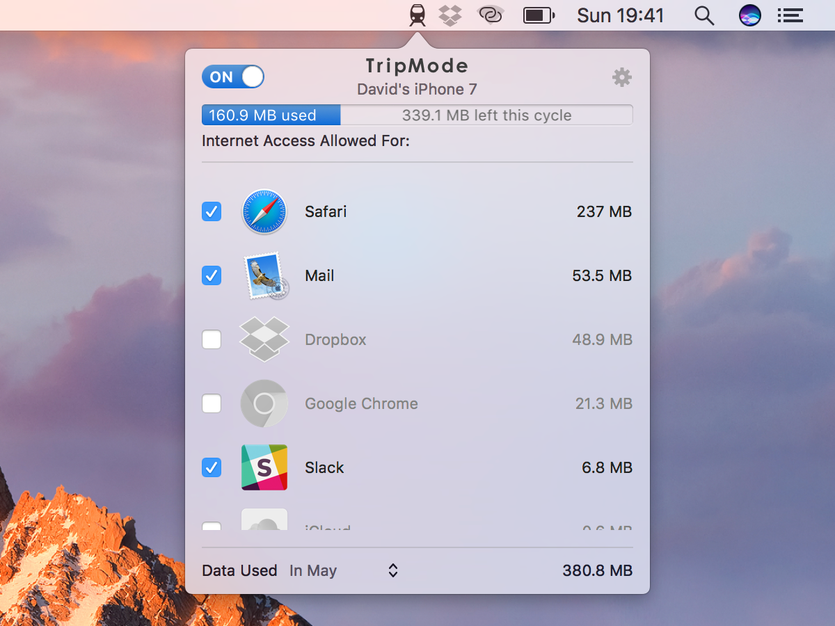 Aplikácia TripMode vám umožňuje určiť, ktoré aplikácie získajú prístup na internet podľa druhu vášho pripojenia. V momente, keď je Mac pripojený k iPhonu, môžete napr. povoliť dátový prístup iba aplikáciám Mail, Správy a Slack, zatiaľ čo po pripojení na Wi-Fi opätovne povolíte prístup pre všetko – TripMode automaticky prepne na správne nastavenie pre každý druh siete – podľa vašich požiadaviek.