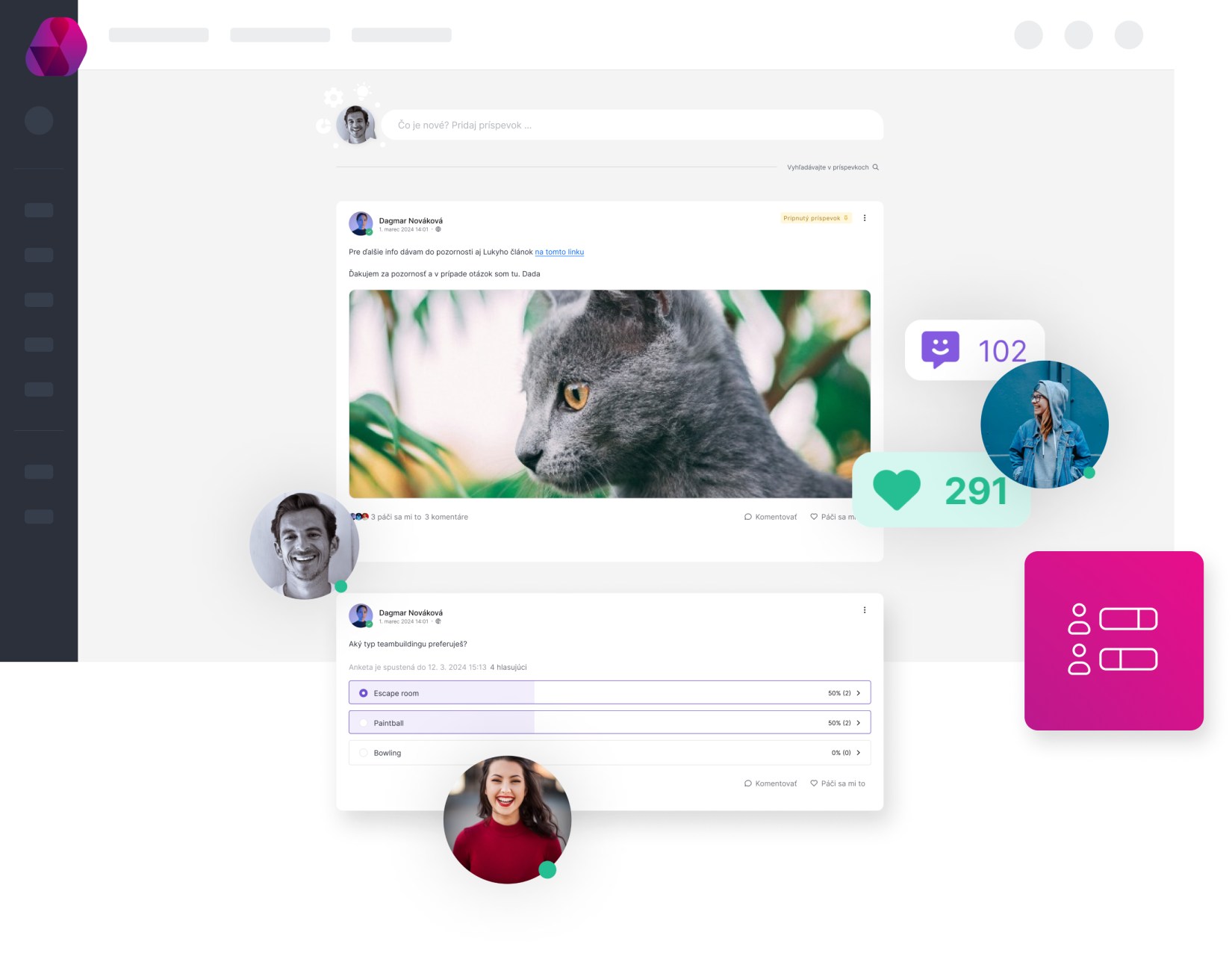 Dosiahli kolegovia úspech v osobnom alebo pracovnom živote? Ukážte svoje míľniky nenásilnou formou. Máte doma malého futbalistu alebo modelára? Podeľte sa s kolegami o zaujímavosti cez rozhranie intranetu. Kolegovia sa potešia a zároveň ich nespamujete cez emaily. Radi príspevky „olajkujú“ a pridajú komentár. Ideálne na zdieľanie nápadov. A je to prirodzenejšie ako rozposielať hromadné emaily.