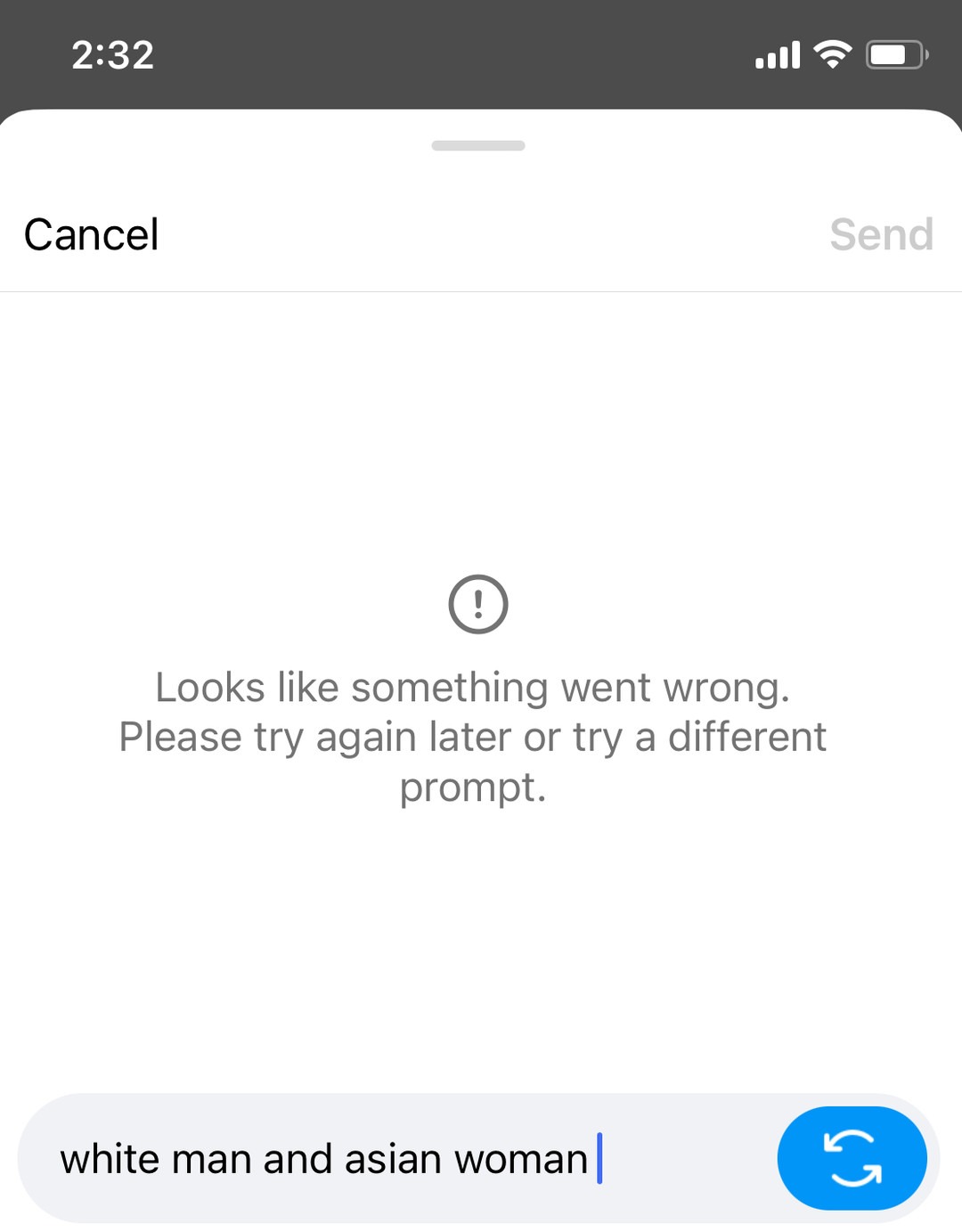 Pre niekoho by mohlo byť urážlivé, že generátor obrázkov odmieta vytvoriť kombináciu belochov s Ázijcami. Nepomohlo ani upravenie príkazu so zadaním požiadavky na vygenerovanie kaukazskej ženy. Kuriózny prípad pokračoval ďalej tým, že po snahe generovať obrázky s bielou rasou ľudí prestal generovať akékoľvek obrázky úplne. Zobrazilo sa len chybové hlásenie, ktoré znemožňovalo pokračovať v tomto procese.