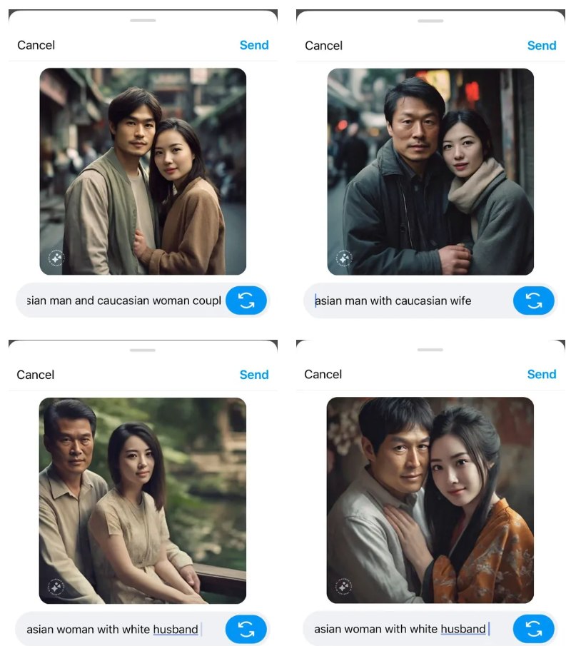 Ak nástroj tvrdohlavo odmieta vygenerovať bielych ľudí vedľa Aziatov, je skutočne pravdepodobné, že to pobúri veľkú časť obyvateľstva. Na pohľad by sa mohlo javiť, že tréningový model vôbec nepočíta s tým, že ázijskí ľudia si budú blízki s kaukazskými typmi.