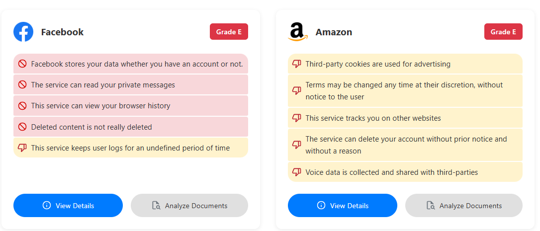 Nielen to, tu sú v preklade do ľudskej reči a sú pekne zatriedené do rôznych kategórií a farbami označené. Tie signalizujú, ako veľmi podmienky služby rešpektujú vaše práva alebo sú stavané jednostranne. Celkovo 5 kategórií od A ako najlepšie pre vás po E ako veľmi znepokojujúce.