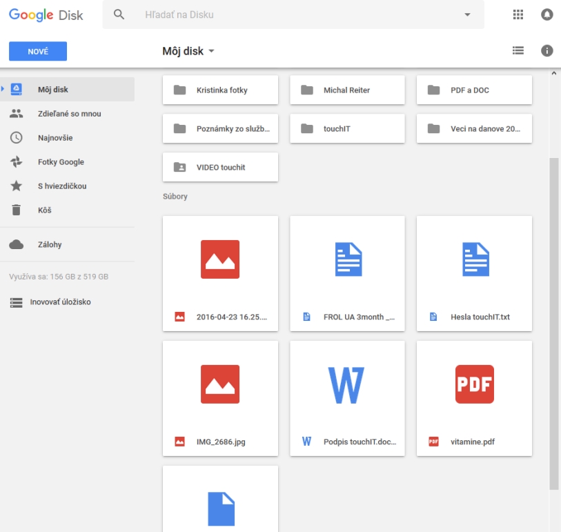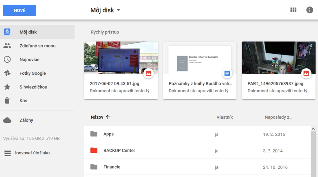 Túto službu sme si obľúbili najmä z dôvodu používania telefónu s Androidom. Webové rozhranie je pohodlné a naozaj rýchle. Tu sa služba najviac podobá na Prieskumníka z Windows. Prechádzanie medzi adresármi je takmer rovnako rýchle ako prechádzanie adresármi na počítači. Najpoužívanejšie adresáre si môžete označiť hviezdičkou a mať k nim rýchlejší prístup. Najmä ak ide o adresáre, ktoré sú niekoľko úrovní vnorené v iných adresároch. Adresáre sa dajú označovať farbami, čo pomáha v rýchlejšom prehľade, zdieľané sú označené ikonou figúrky. Všetky dáta, ktoré odstránite sa presunú najprv do koša. Ak sa ich rozhodnete obnoviť, pokojne ich z koša zase presuniete späť. V prípade, že odstránite súbory, ktoré s vami niekto zdieľal, pôvodnému vlastníkovi stále zostávajú. Google Disk má samostatnú kategóriu zobrazenia dát, ktoré s vami niekto zdieľal. Už pred niekoľkými mesiacmi pridal Google ďalšiu funkciu navyše a tou je zobrazovanie záloh telefónov s Androidom. Nemáte možnosť prezerať dáta, bolo by vám to prakticky nanič. Avšak ak často meníte telefóny alebo si len chcete udržiavať prehľad o zálohách, je to vhodná funkcia. Zálohy sa dajú aj odstraňovať. Pozrite sa určite do kategórie zálohy, kde uvidíte, aké androidové telefóny máte zálohované. Keď potom kúpite nový telefón a prihlásite sa do neho, dáta si doň môžete obnoviť. Nie síce kompletne ako pri špecializovaných nástrojoch od výrobcu, ale konfiguračné záznamy o aplikáciách určite.