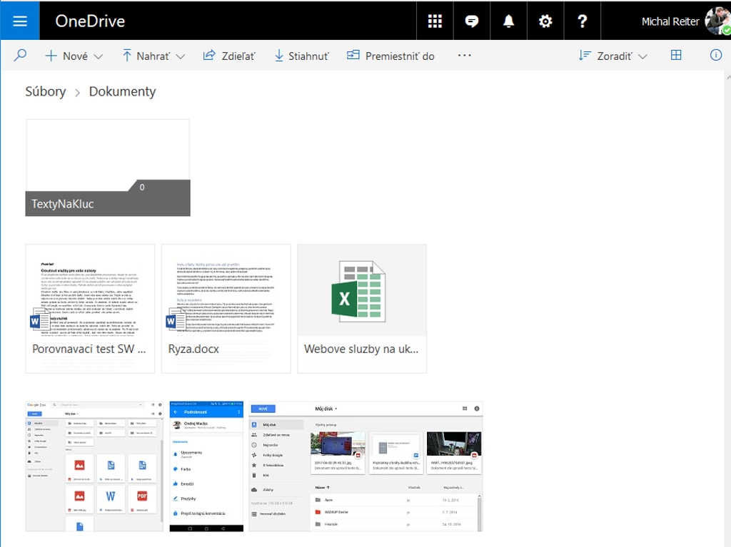 Služba OneDrive je jednoznačne najlepšou voľbou pre používateľov Microsoft Office vďaka vynikajúcej kompatibilite naprieč platformou Microsoftu. Okrem bežného úložiska získavate aj kancelárske aplikácie (rovnako ako pri Googli) a jednotný priestor pre vaše dáta. Priamo odtiaľto môžete pristupovať k emailu Outlook.com, vytvárať dokumenty, pracovať s poznámkovým blokom OneNote a samozrejme aj ukladať fotky. Aplikácia pre túto službu je dostupná pre telefóny ako aj počítače. Tu je rozšírená funkcionalita a môžete si zvoliť predvolené ukladanie súborov. To si inak môžete všimnúť aj pri inštalácii Windows 10. Všetko, čo budete chcieť uložiť sa prioritne bude v dialógovom okne Uložiť ako zobrazovať v lokalite OneDrive. Vždy sa dá ale dokument uložiť iba na lokálny disk. Takisto sa dajú automaticky presúvať fotografie z pripojených zariadení. Je to služba navyše a kto chce používať ekosystém Microsoftu, OneDrive je bez debaty číslo jedna. Webové rozhranie podporuje nahrávanie celých adresárov ako aj samostatných súborov, a to tiež pretiahnutím obsahu do prehliadača. Na tejto službe nám historicky prekáža len pomalý upload. Uviedli sme, že ju paradoxne používame na presun veľkého objemu dát. Áno, ale počítame s tým, že prenos bude tak 4 až 5-krát pomalší ako pri Google Disk. Rozhranie má tri typy zobrazenia súborov, pričom Disk len dva. Tu je ale tretí spôsob zobrazenia fotografií. To Google rieši vlastnou službou Fotky. Priamo cez toto rozhranie môžete posielať Skype správy alebo uskutočniť hovor. V prípade, že vymažete nejaký súbor, presunie sa do koša. Takisto tu funguje zobrazenie histórie verzií a u podporovaných súborov sa bude zobrazovať aj ich obsah. Služba OneDrive patrila medzi inovatívne služby. Neprichádzala každú chvíľu s nejakou malou a nepodstatnou funkciou. Ak už Microsoft na OneDrive niečo zmenil, bolo to podstatné. Vyberať súbory môžete aj označením myšou, podobne ako v Prieskumníkovi. Vlastne OneDrive sa princípom, ikonami a jednoduchosťou podobá na Prieskumníka najviac. Je tiež najrýchlejšia pri práci v prostredí tejto služby. Nie síce o veľa ako pri Disk alebo Dropboxe, no už sa to blíži komfortu miestneho správcu súborov. Medzi vynikajúce funkcie patrí časové zdieľanie. Jednoducho nastavíte počet dní, po ktoré má byť odkaz na súbory alebo adresáre aktívny. Potom sa zdieľanie s používateľmi automaticky vypne. Aplikácia cez smartfón je výborná, podobá sa na webové rozhranie a viac na grafický štýl Windows ako na Material Design od Googlu.