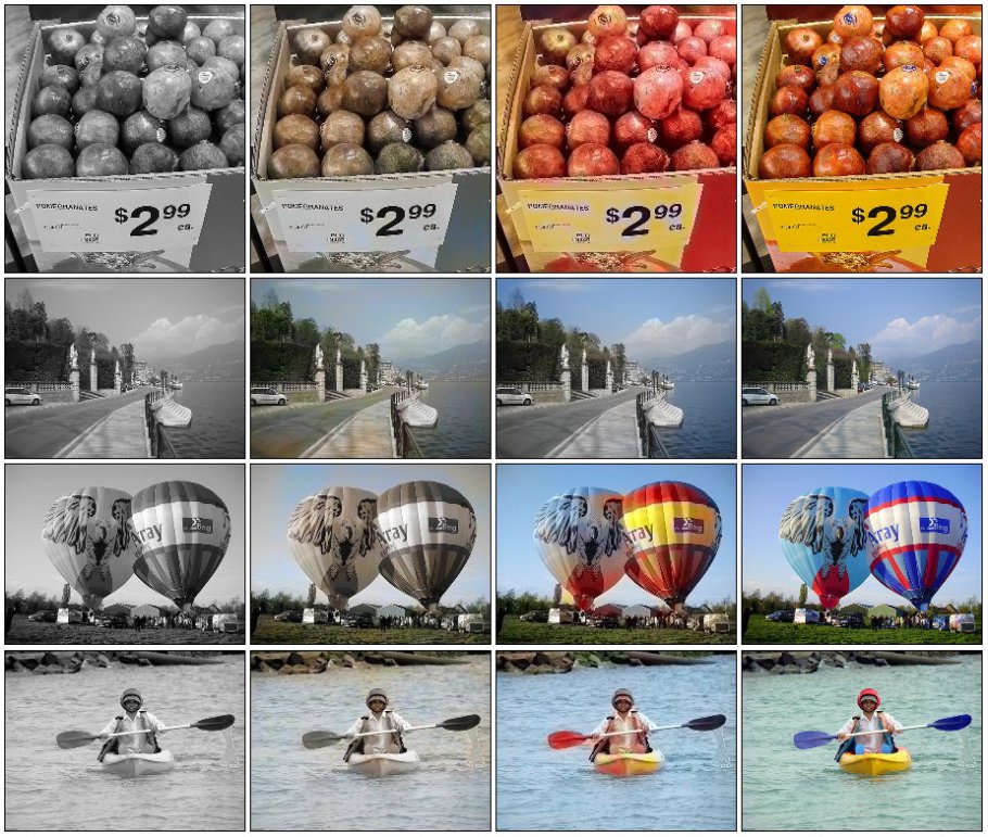 Kolorizovanie čiernobielej fotografie (prvý stĺpec) neurónovou sieťou. Druhý stĺpec ukazuje ešte donedávna dosahované výsledky, trpiace desaturáciou, zatiaľ čo tretí stĺpec už predvádza výsledky nového riešenia neurónovej siete univerzity v Berkeley. Štvrtý stĺpec ukazuje pôvodnú farbu obrázkov, ktoré slúžili pre vytvorenie čiernobielej predlohy