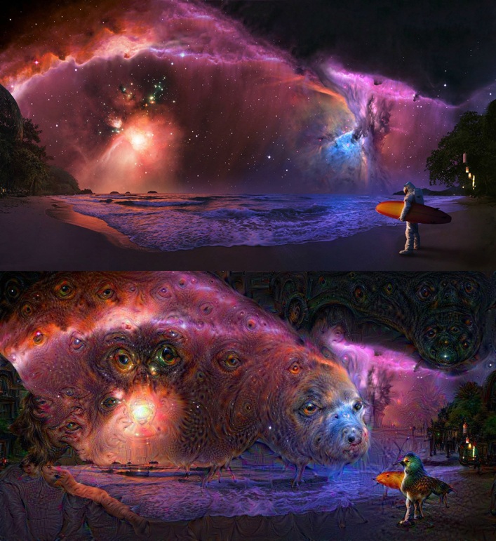 Kým nízke vrstvy neurónov konvolučnej siete obrázok postupne pretvárali do ornamentov (pretože „túžia“ po pekných ostrých hranách), vysoké sofistikované vrstvy „snívali“ o čudesných tvárach. Ide o zaujímavý pohľad na to, ako sieť pracuje. Niektoré obrázky sú skutočne čudesné a pripomínajú šok, aký spôsobuje špecifické poňatie reality rôznych umelcov. V tomto roku dokonca prebehla aj výstava týchto výtvorov v San Franciscu a ich následná aukcia.