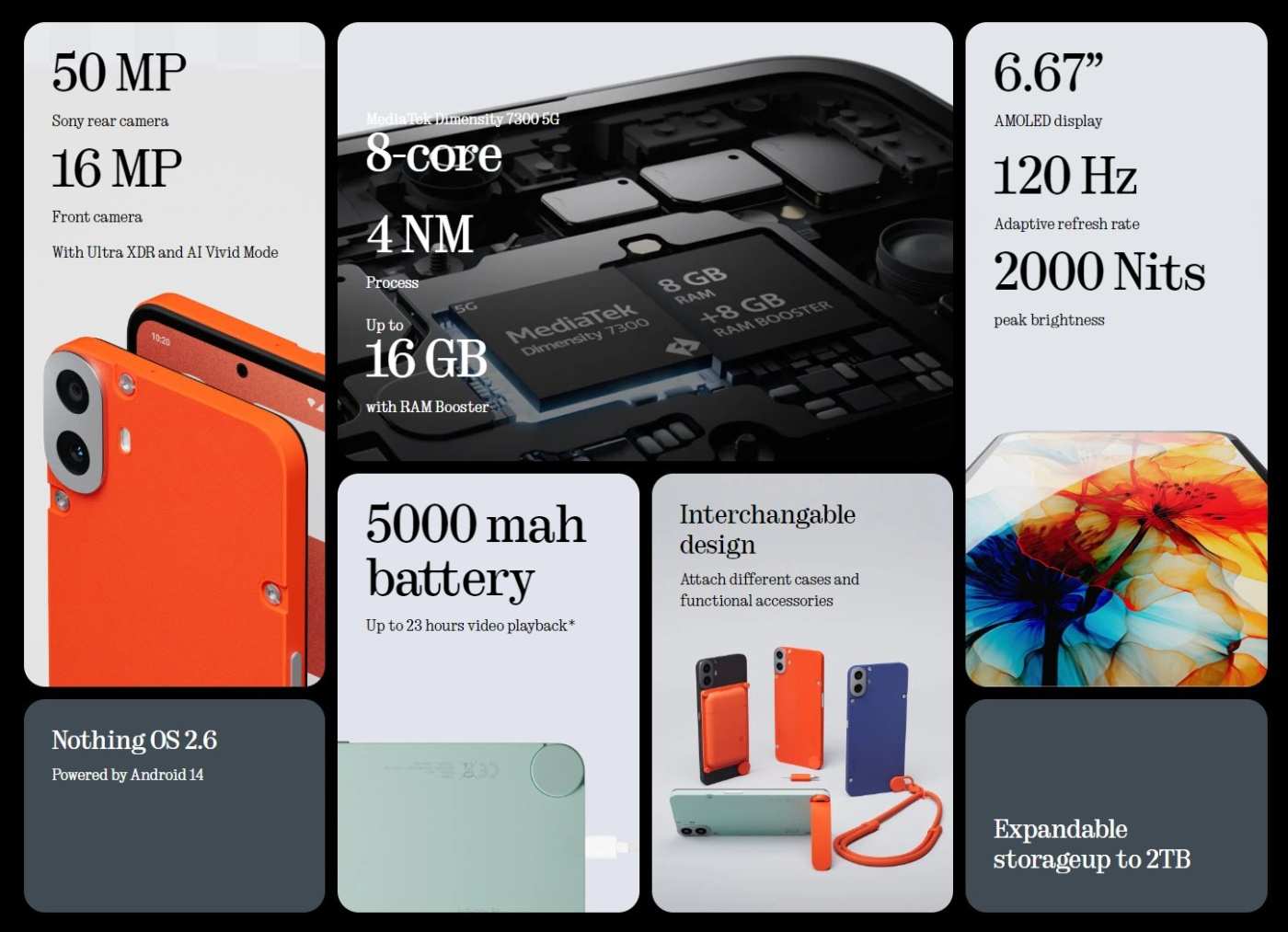 CMF Phone 1 prichádza “v základe” s charakteristickou oranžovou farbou, ale k dispozícii budú aj viaceré možnosti personalizácie. Medzi hlavné prednosti telefónu patria 4nm čipová sada Dimensity 7300 5G, 50 Mpx hlavný fotoaparát so senzorom od Sony, 16 Mpx selfie fotoaparát, 6,67-palcový AMOLED displej a jedinečný vymeniteľný dizajn. Čipovú sadu pritom dopĺňa až 16 GB pamäte RAM cez funkciu RAM booster (základ je 8 GB). Okrem 128 GB úložného priestoru bude k dispozícii aj 256 GB verzia. Ak by vám však toto úložisko nepostačovalo, tak je ho možné rozšíriť o 2 TB pomocou pamäťovej karty. Telefón disponuje aj odolnosťou IP52.