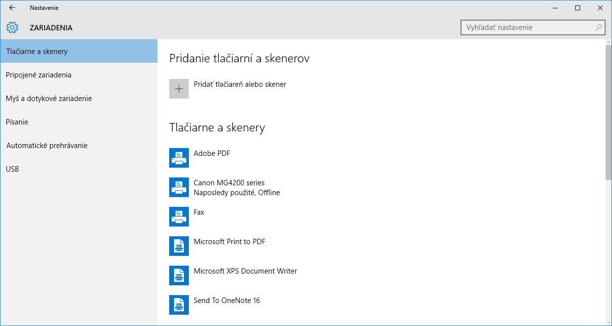 Sekcia tlačiarní a skenerov v nastavení Windows 10