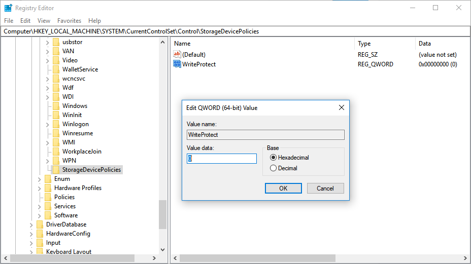 Následne na ňu kliknite pravým tlačidlom myši a vytvorte v nej 64-bitovú hodnotu New/QWORD (64-bit), pričom ju nazvite ako WriteProtect. V okne napravo ju dvojklikom otvorte a skontrolujte, či má nastavenie 0 (Hexadecimal). Toto nastavenie bude prednostne brané v prípade konfliktov a systému bude oznamovať, že pripájané zariadenia nie sú chránené proti zápisu (write protected). Editor registrov zavrite a formátovanie znova vyskúšajte.