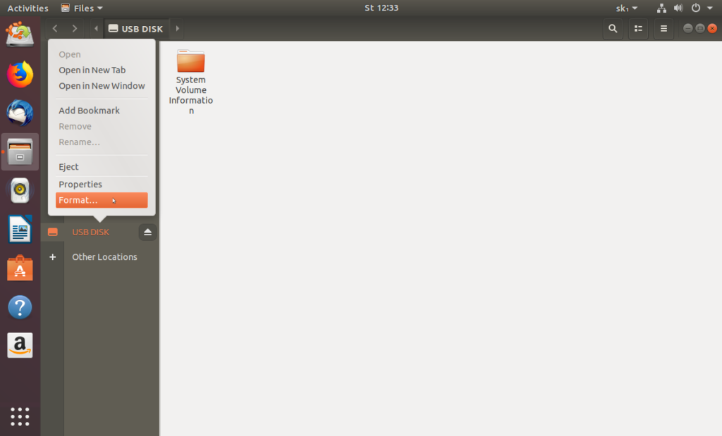 Po nabehnutí Linuxovej pracovnej plochy pripojte k počítaču nejaký USB kľúč. Všimnite si, že na ploche Ubuntu preň okamžite pribudne ikona. Otvorte ju dvojklikom, pričom na paneli vľavo kliknite pravým tlačidlom myši na jeho položku a vyberte možnosť Format. V okne Volume Name zadajte ľubovoľnú menovku (napr. Moj kluc) a kliknite vpravo hore na Next a následne Format. Kľúč zmizne, pričom čakajte až do momentu, kým sa v ponuke znova objaví (formátovanie bolo úspešné), prípadne do momentu, keď sa zobrazí informácia o neúspešnom formátovaní. Počítač následne reštartujte a nechajte spustiť Windows.