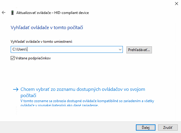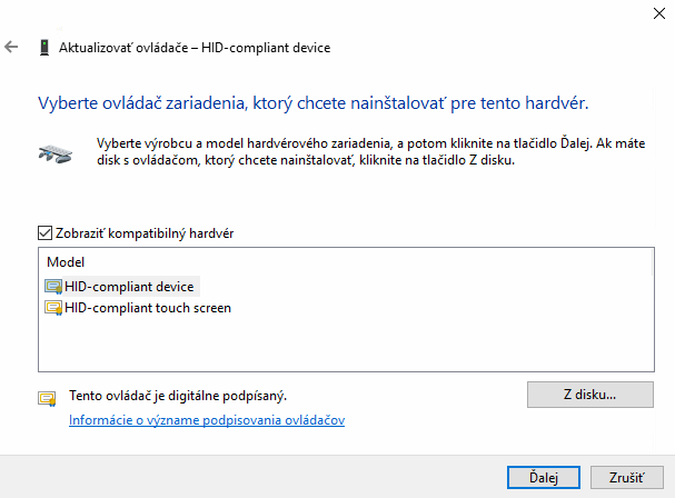 Zobrazí sa okno s kompatibilnými ovládačmi pre váš hardvér, pričom vyberte ten, ktorý nie je aktuálne zavedený a kliknite na tlačidlo ďalej. Výmena ovládača prebehne a dotyková vrstva by mala ihneď fungovať.