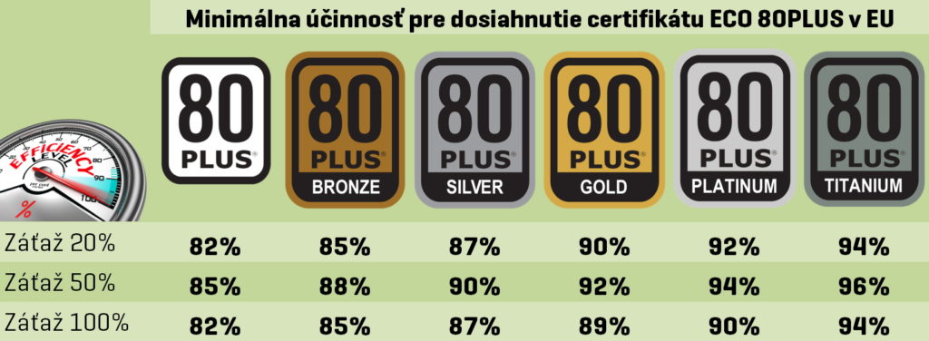 Voľte pri tom model s certifikátom 80PLUS Gold, ktorý značí, že zdroj musí pri polovičnej záťaži dosiahnuť aspoň 90 % účinnosť a zhruba 90 % pri plnom a pätinovom výkone. To zaručí, že v jeho vnútri budú vskutku kvalitné komponenty. Je pravdaže možné nájsť aj zdroje s vyššími certifikátmi, ako Platinum a Titanium, ale to už prekročíte sumu 100 eur a rozdiel v kvalite už nebude taký skokový, ako od lacných nekvalitných zdrojov smerom ku kvalitným s Gold certifikátmi.