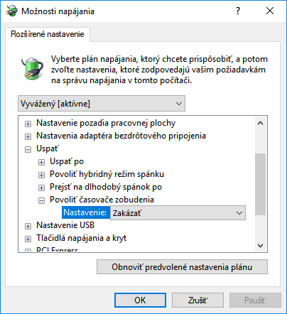 Je možné takisto použiť globálne nastavenie, ktoré v základe potlačí všetky takéto naplánované prebudenia. Otvorte Nastavenia Windows a v sekcii Systém otvorte kategóriu Napájanie a spánok. Kliknutím na Ďalšie nastavenia napájania otvoríte relevantnú sekciu Ovládacieho panelu s režimami napájacích plánov. Na ten, ktorý je momentálne aktívny kliknite a otvorte jeho sekciu Zmeniť nastavenia plánu a následne na Zmeniť rozšírené nastavenia napájania. V otvorenom okne rozbaľte ponuku Uspať/Povoliť časovače zobudenia, ktoré zakážte. Kliknite následne na tlačidlo Použiť a v hornej časti okna sa prepnite na iné plány, ktoré používate a zakážte časovače zobudenia aj tam.