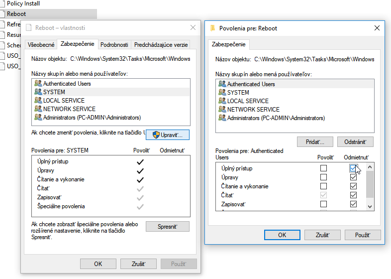 Úloha je fyzicky uložená v priečinku C:/Windows/ System32/ Tasks/ Microsoft/ Windows/ UpdateOrchestrator, pod názvom Reboot. Po tom, ako ju v Plánovači úloh nastavíte na vypnutú, kliknite na jej fyzický súbor pravým tlačidlom myši a zvoľte Vlastnosti. V otvorenom okne sa prekliknite na kartu Zabezpečenie a všetkým skupinám a používateľom (vrátane položky SYSTEM a takisto svojho účtu) odoberte práva na zápis a úpravu tohto súboru. Nemusíte sa báť odobrať každému účtu všetky práva. Kedykoľvek budete môcť takýmto istým spôsobom tieto pravidlá editovať a práva zas vrátiť komukoľvek, vrátane seba.