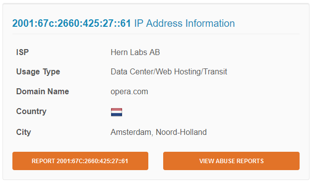 Pri pátraní po skutočnom majiteľovi IP adresy 2001:67c:2660:425:27::61 sa ukazuje, že jej vlastníkom je holandský provider Hern Labs AB, pričom ju prideľuje v rámci služieb dátových centier a internetových tranzitných spojení, v súvislosti s doménou Opera.com.