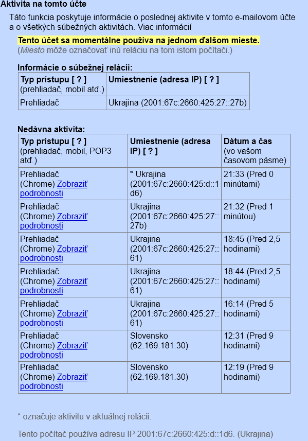 Zmena vášho hesla ku Gmail účtu bola na prvý pohľad logická. Určite vám totiž prišlo od Googlu upozornenie, že na vašom účte dochádza v krátkej dobe k prihláseniam z rôznych štátov, takže vám zmenu hesla odporučil. Za normálnych okolností to totiž indikuje, že účet bol kompromitovaný a treba ho okamžite zabezpečiť. Tento krok bol ale zrejme z vašej strany zbytočný. Na logu, ktorý ste nám zaslali je totiž vidieť, že tie prístupy zo Slovenska a Ukrajiny vykonal váš počítač, takže o žiadneho cudzieho útočníka nešlo.