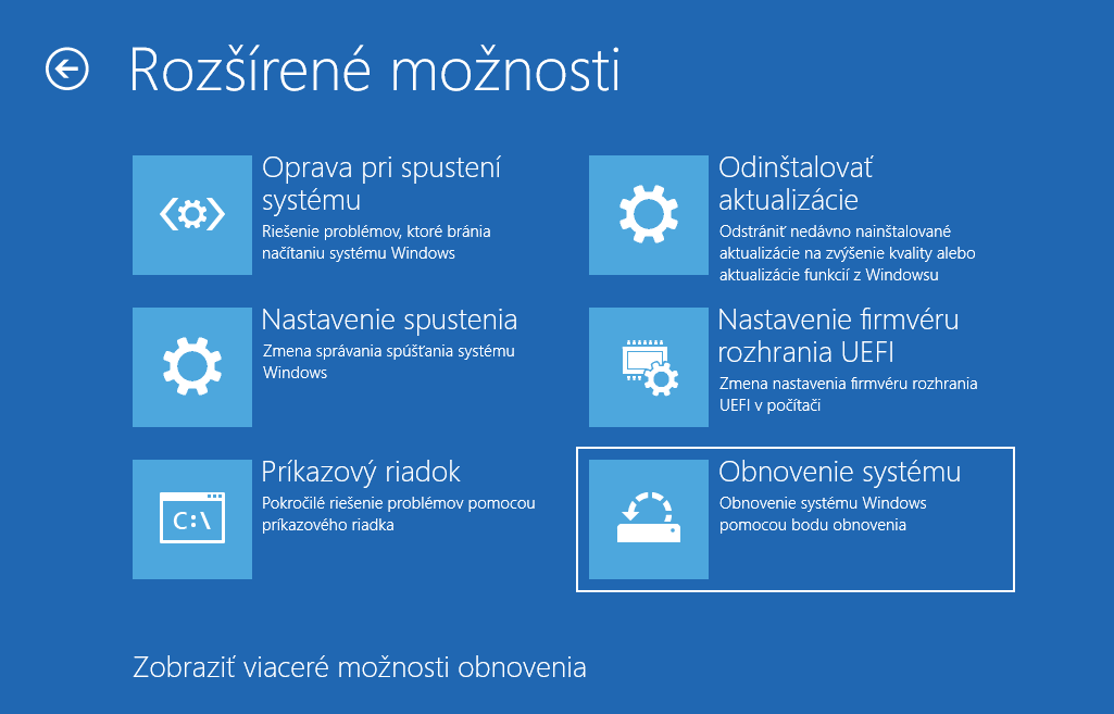 Nástroj na obnovu spustíte kliknutím na sekciu Riešiť problémy, kde POZOR, neklikajte na možnosť Obnoviť výrobné nastavenia, ale na Rozšírené možnosti. Až tam nájdete položku Obnovenie systému, ktorú spustite.