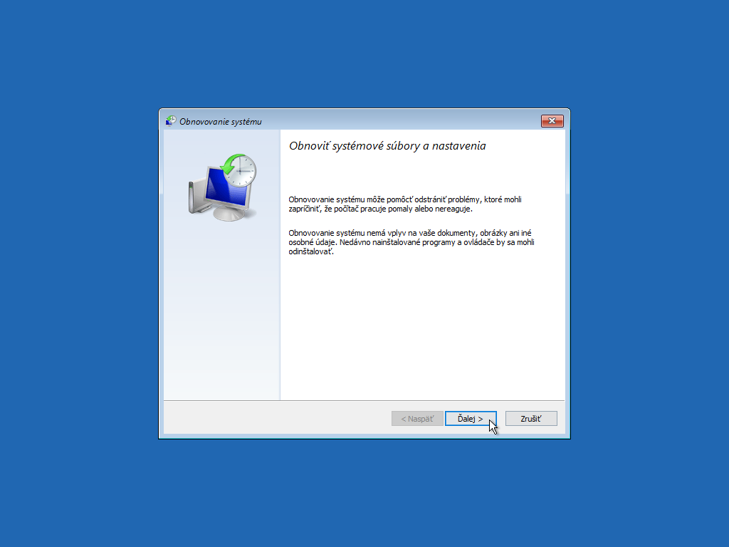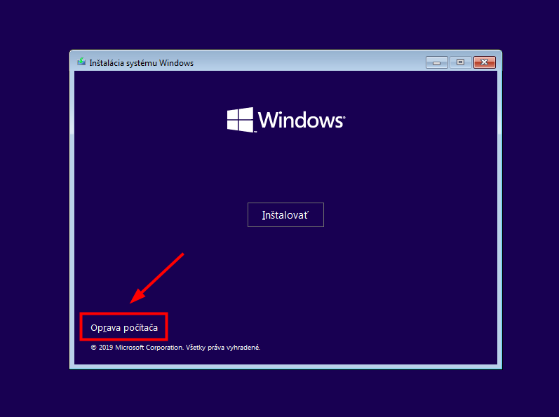 Opravu s pomocou inštalačného média vykonáte tak, že ho zasuniete do počítača a po reštarte spustíte (nastavením bootovania v BIOS-e, alebo s použitím rýchleho jednorazového výberu bootvanie). V prvom okne odsúhlaste slovenské nastavenie a kliknite na tlačidlo Ďalej.