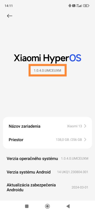 V našom prípade verzia systému s označením 1.0.4.0.UMCEUXM značí, že ide o prvú verziu systému Xiaomi HyperOS. Označenie písmenami v kóde poukazuje na Android U, teda Android 14. Písmenká MC odkazujú na model Xiaomi 13, EU na európsku verziu systému a XM zasa že ide o distribúciu priamo od Xiaomi, nie od mobilného operátora. NA našom trhu sa však toto označenie písmenami môže líšiť, EU môže nahradiť MI v prípade globálnej lokalizácie systému a XM zasa napríklad označenie OR ako úprava operačného systému operátorom Orange. Smartfóny od mobilného operátora pritom zvyčajne získavajú aktualizácie neskôr.