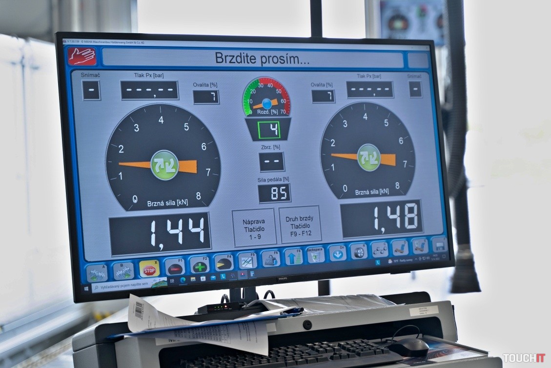 Vozidlo ďalej pokračuje nad montážnu jamu a tu sa začína s kontrolou funkcie bŕzd a ich súmernosť. Meria sa jednak brzdiaci účinok pričom sa zisťuje aj sila, akú vyvíjate na brzdový pedál.