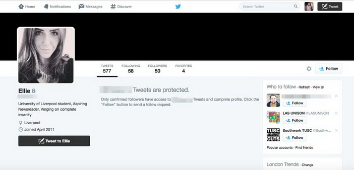 Falošný Twitter profil s fotkou Ellie, s niekoľkými stovkami tweetov