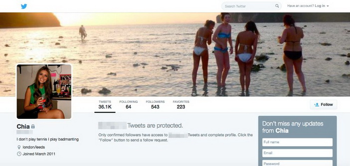 Ellina priateľka Chia na falošnom Twitter účte. Mal viac ako 36 000 tweetov