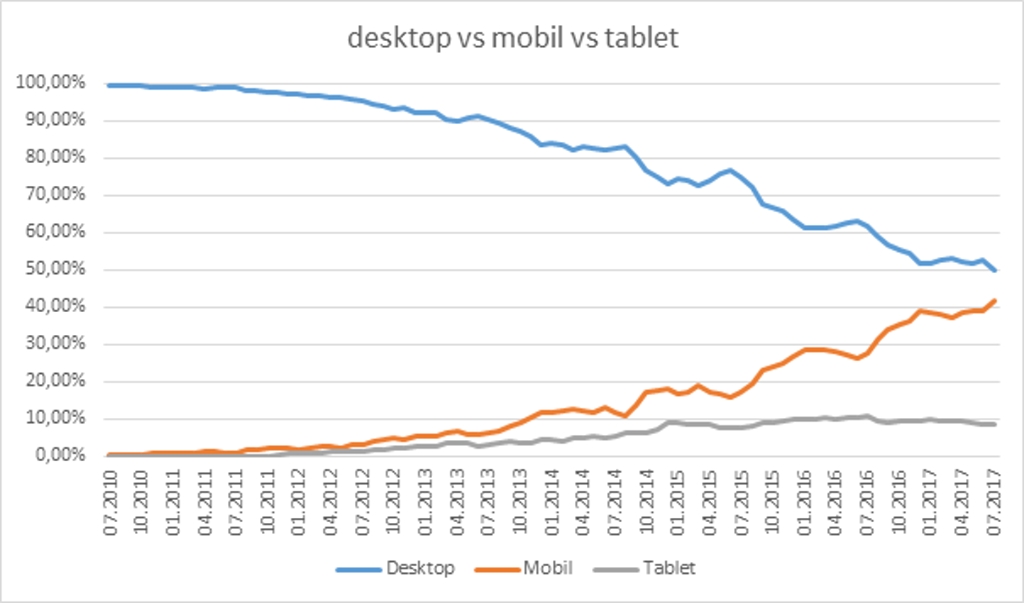 V Effectix.com bol vytvorený prehľad návštevnosti od júla 2010 do júla 2017 s vývojom prístupov cez mobily, tablety a počítače. Aj na Slovensku je vidieť narastajúci trend návštevnosti z mobilných zariadení. V mesiaci júl 2017 dokonca mobily a tablety presiahli viac ako 50 % návštevnosti na weboch zahrnutých do prieskumu.