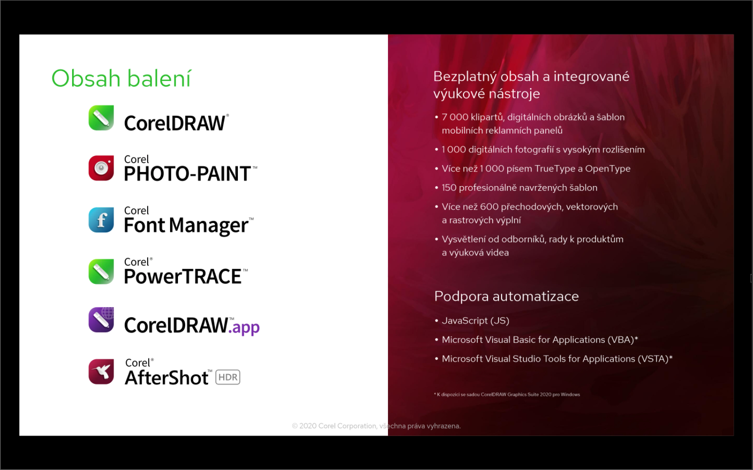 CorelDRAW Graphics Suite 2020 umožňuje vytvoriť grafické obrazce za pomoci umelej inteligencii (AI), pôsobivému vylepšenia výkonu a prístupu k spolupráci založenému na cloude. Grafický softvér CorelDRAW 2020 je aplikácia pre MacOS a Windows a webová aplikáciu CorelDRAW.app. Hlavné zlepšenie by mala byť úspora času pri tvorbe grafiky.
