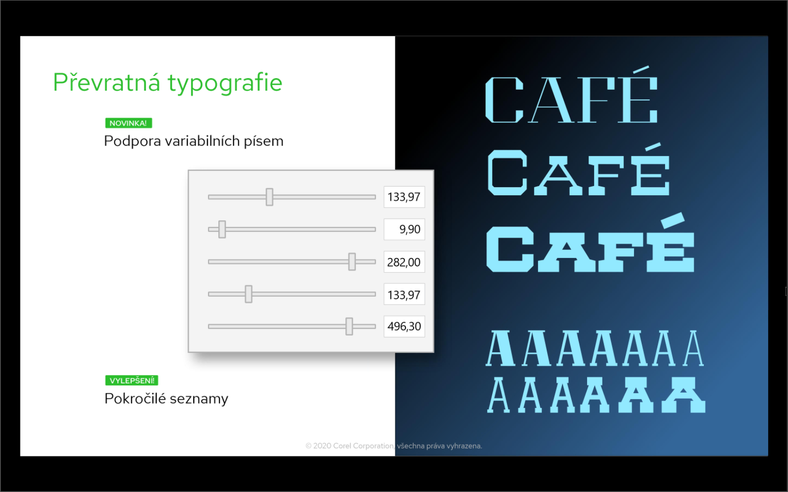 - Práca s variabilnými písmami: Využite najnovšie technológie v oblasti písma s podporou variabilných fontov OpenType, ktoré uľahčujú manipuláciu so vzhľadom textu a dosiahnutie širokej škály jedinečných vzhľadov jednotlivých písiem. Užite si interaktívnu a flexibilnú typografiu a v mnohých prípadoch tiež výrazne menšie veľkosti súborov pri vytváraní súborov s viacerými štýlmi písma.